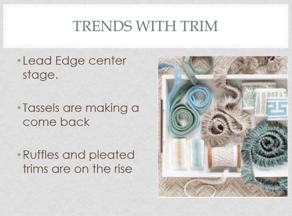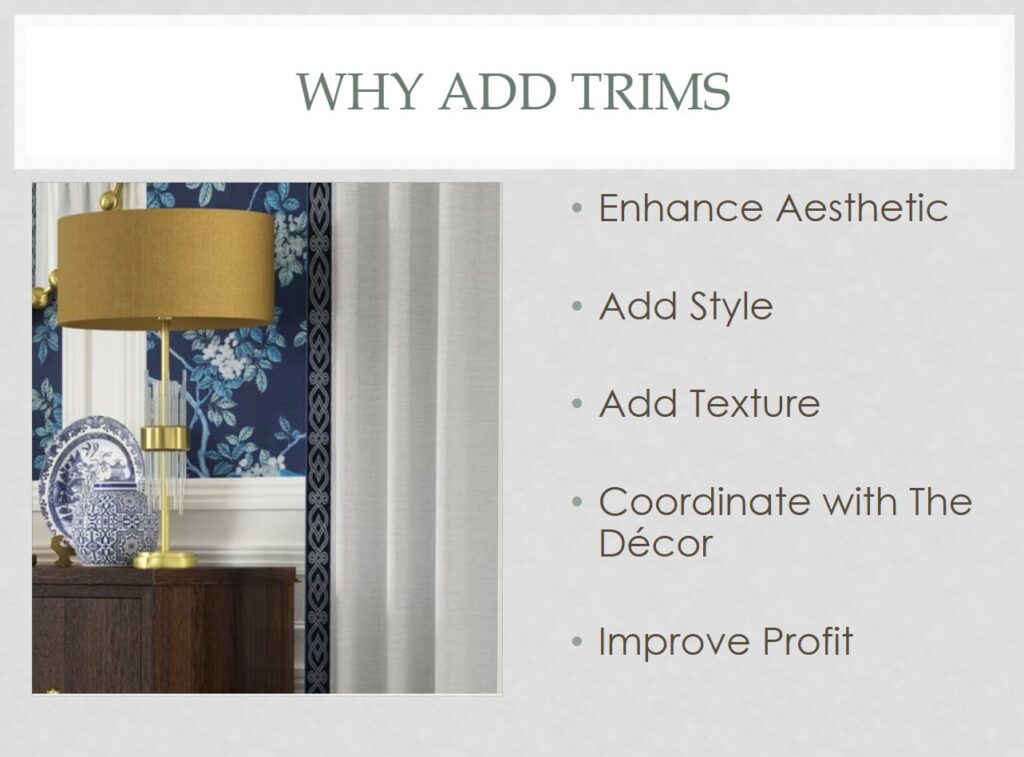 Whether it’s a refined tape detail along the lead edge or a playful tassel accent, trims provide an opportunity to customize and coordinate with the overall décor. They not only enhance aesthetics, but also add value, turning standard panels into distinctive, high-end pieces that reflect craftsmanship and attention to detail.